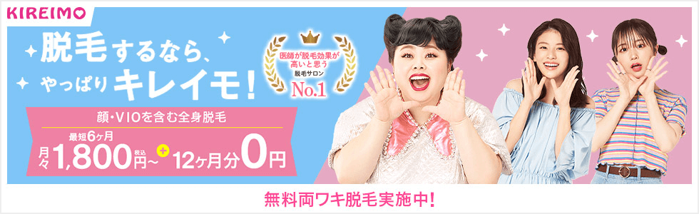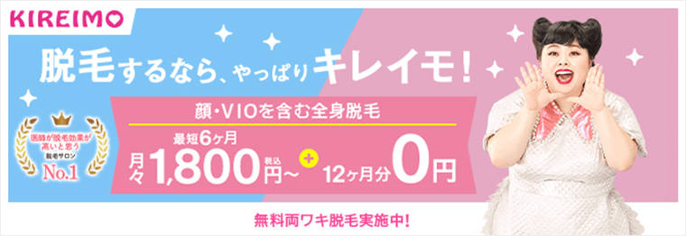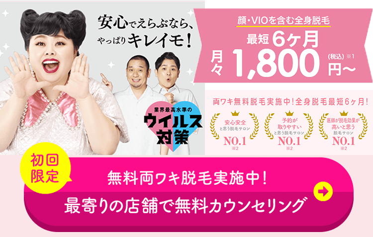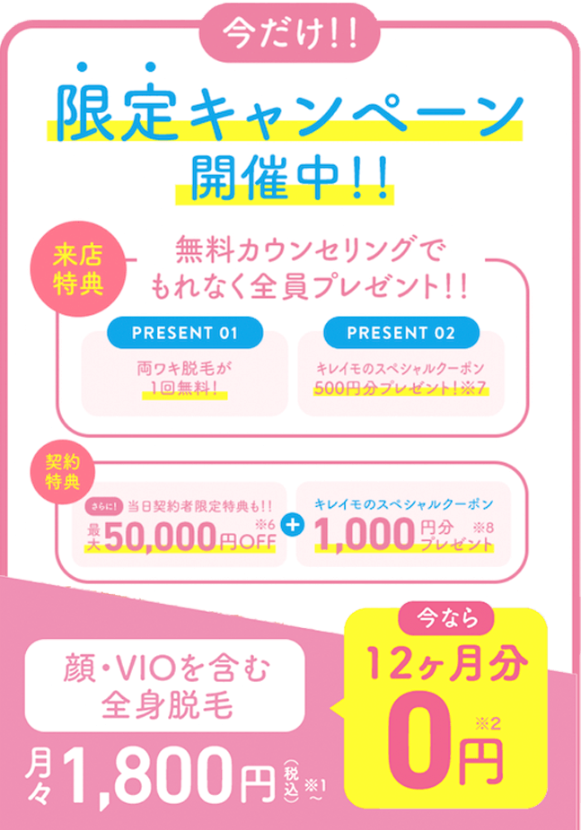 1回の施術で全身まるごと脱毛できるので何回も通う必要がなく、その分予約も取りやすいのがキレイモの特徴!気になる顔・VIOを含む全身脱毛が可能なので、全身まるごと綺麗に脱毛することが可能です。格安のお試しプランなどのお得なプランもあるので、あなたに合ったプランが選べ、他のサロンからののりかえ・学割で最大50,000円OFFになるのも選ばれるポイント♪