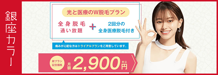 銀座カラーは、エステ脱毛し放題に、医療脱毛が2回も受けられる「W脱毛プラン」があるサロン!